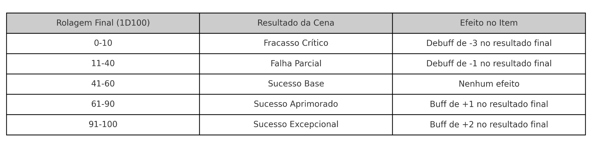 Após cada cena, o player deve rolar 1D100 para verificar o sucesso parcial da etapa.